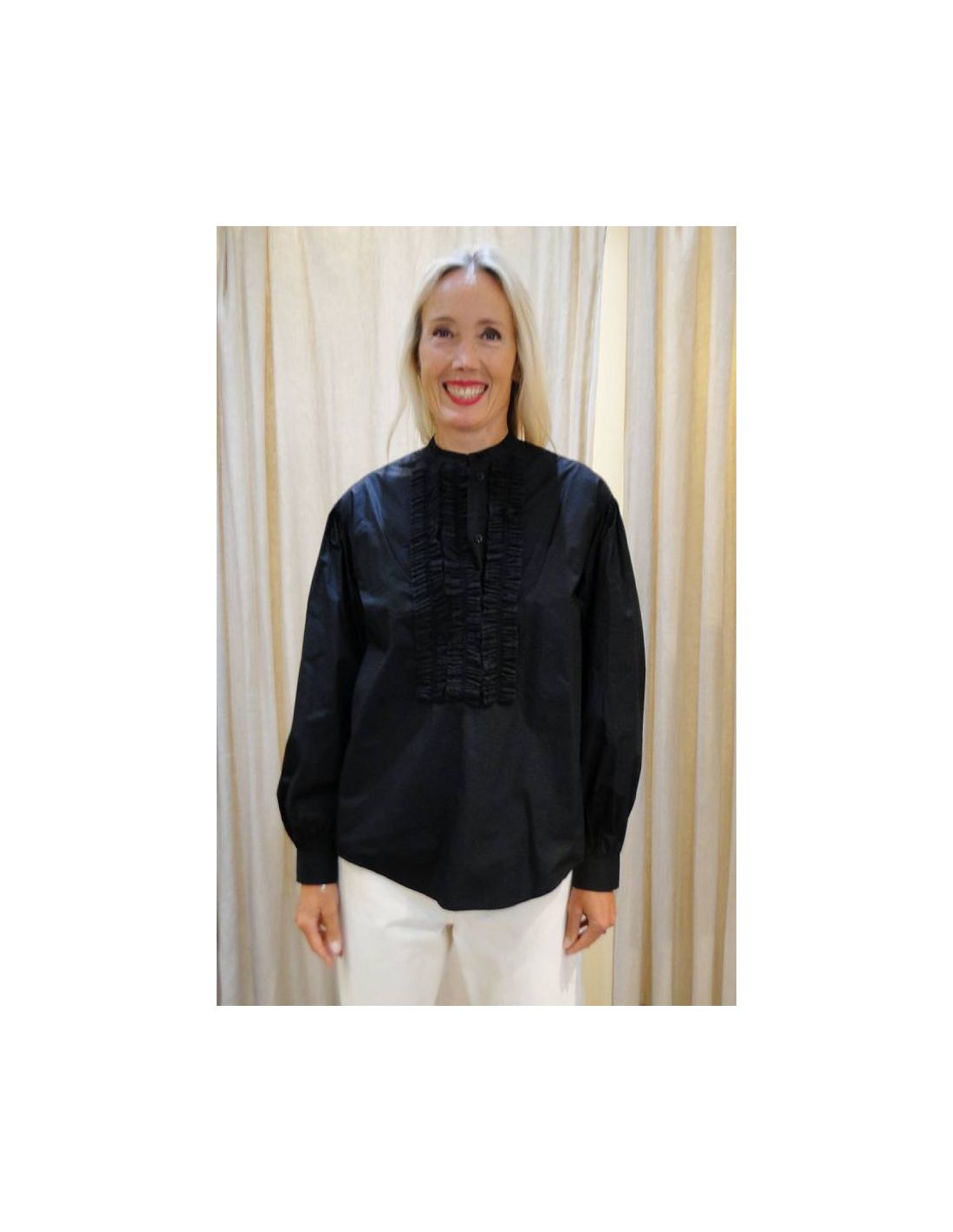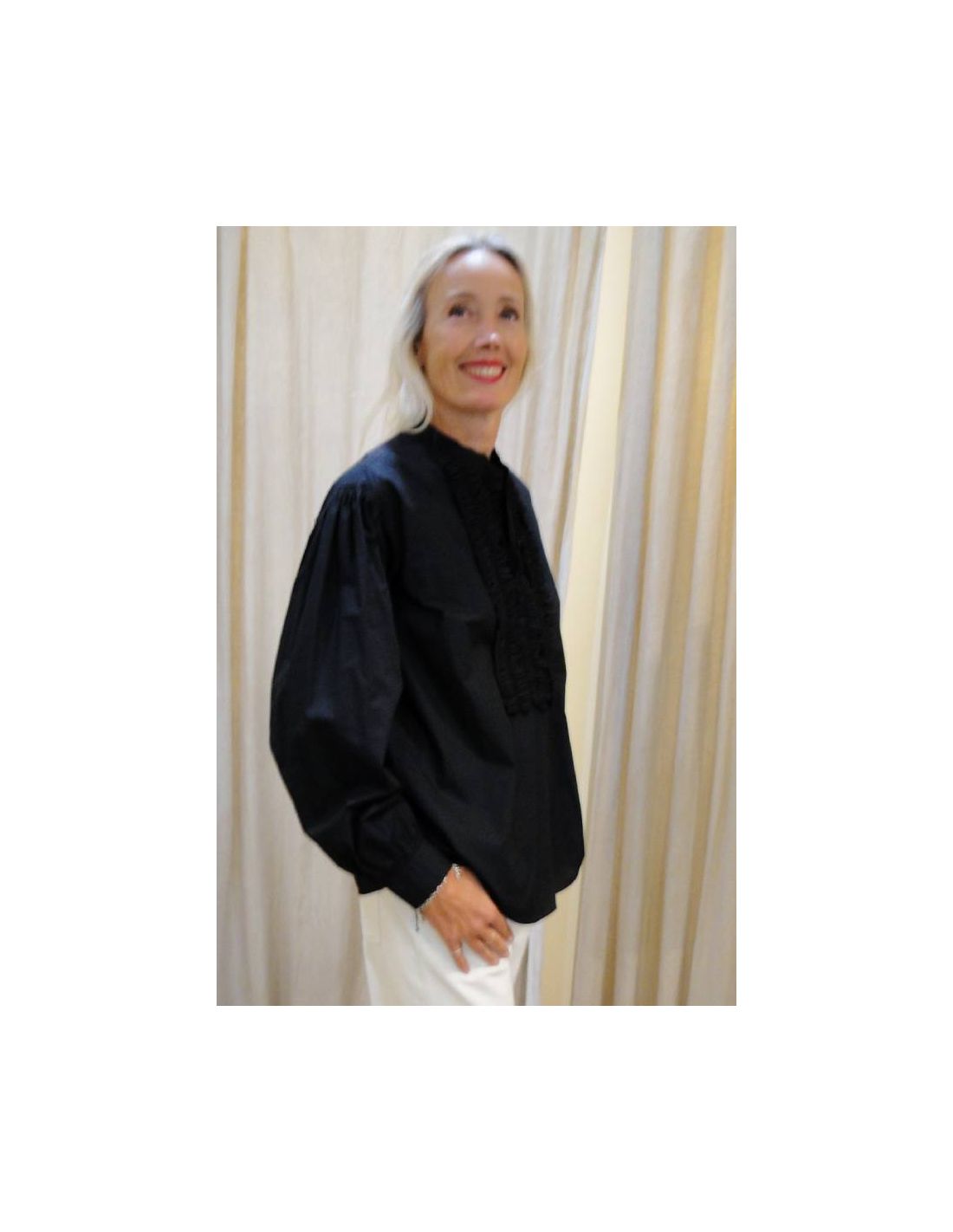 Blouse longue ouverte sur 37 cms avec plastron volanté uni noire . Cette blouse a une amplitude dos, droit devant avec des manches bouffantes évasées. Beaucoup plus...
