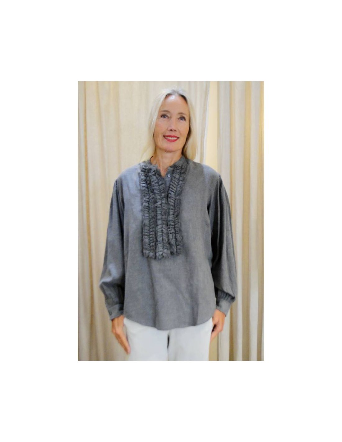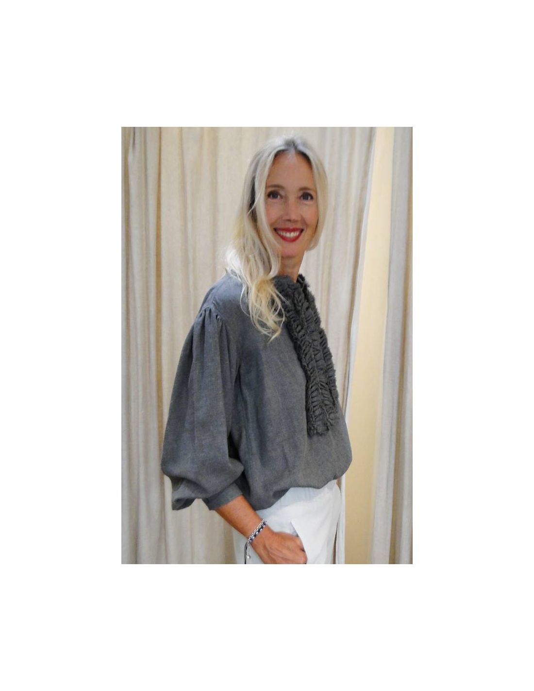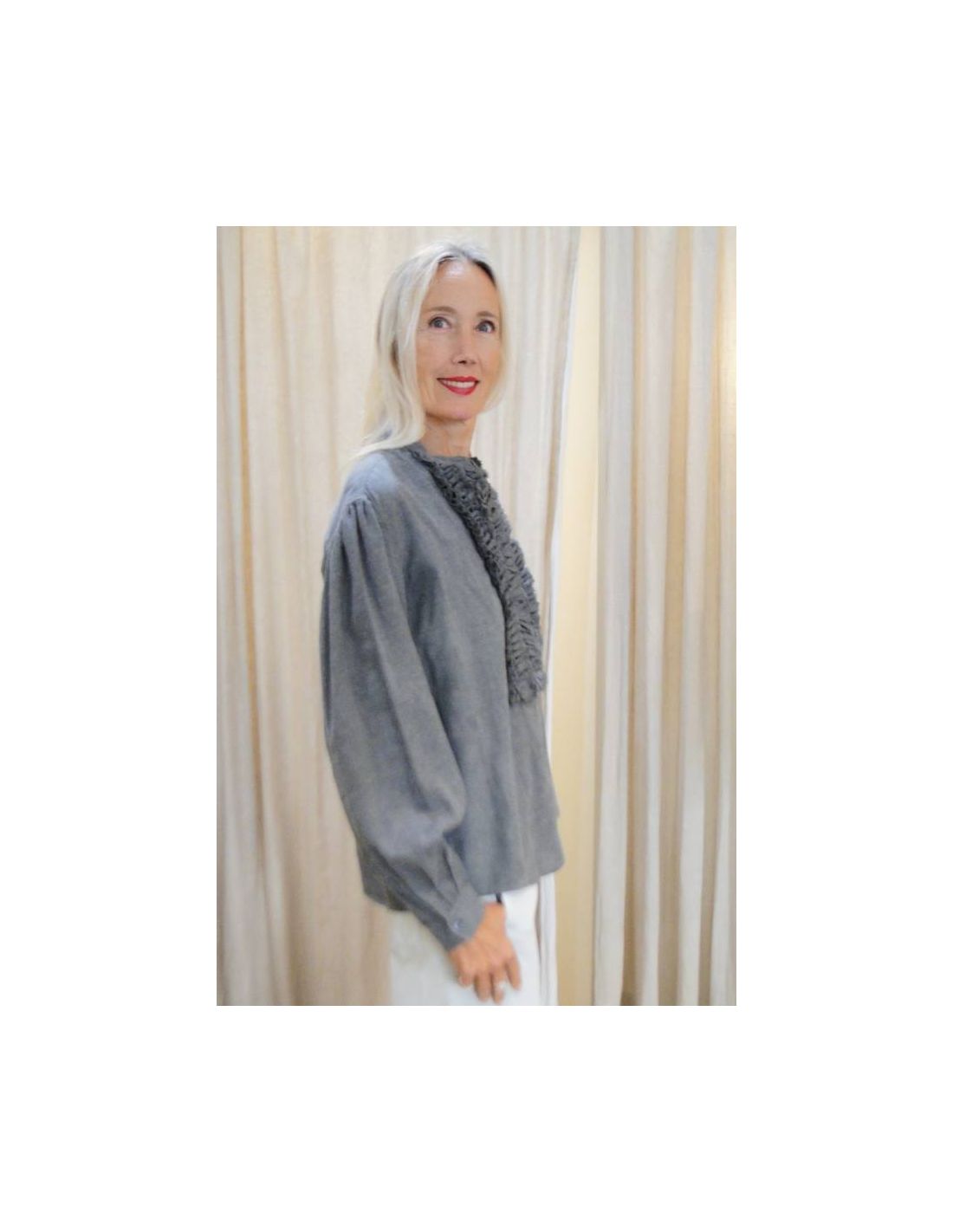Blouse longue en très fine popeline de coton blanche. Elle a une forme peintre avec un volant devant et des boutons nacres à la marque de LAURENCE BRAS. La chemise...