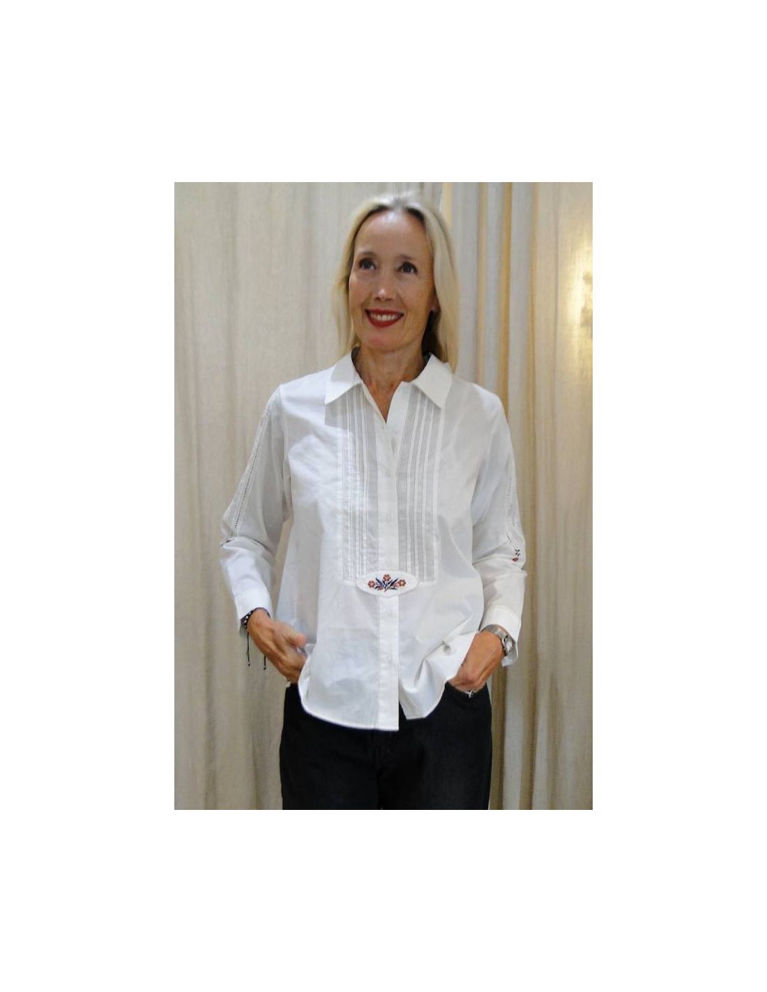 HOD Paris dans la nouvelle collection automne hiver 2025 nous propose un nouveau modèle de Chemise, la chemise KILIAN blanche en coton avec de petites broderies devant et sur les manches. Avec son col chemise, sa forme droite et ses manches longues. La chemise KILIAN a un look avec une pointe romantique avec ses broderies bleux marine et rouge, idéale avec un jean, elle ajoute une note feminine. Sa coupe est droite avec un plastron surpiqué en rouge et de petits plis dos.