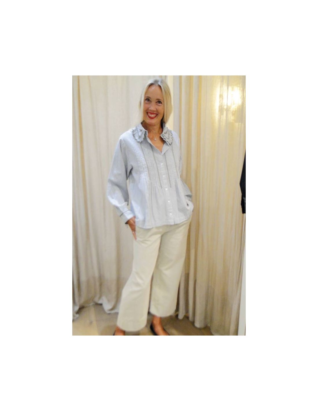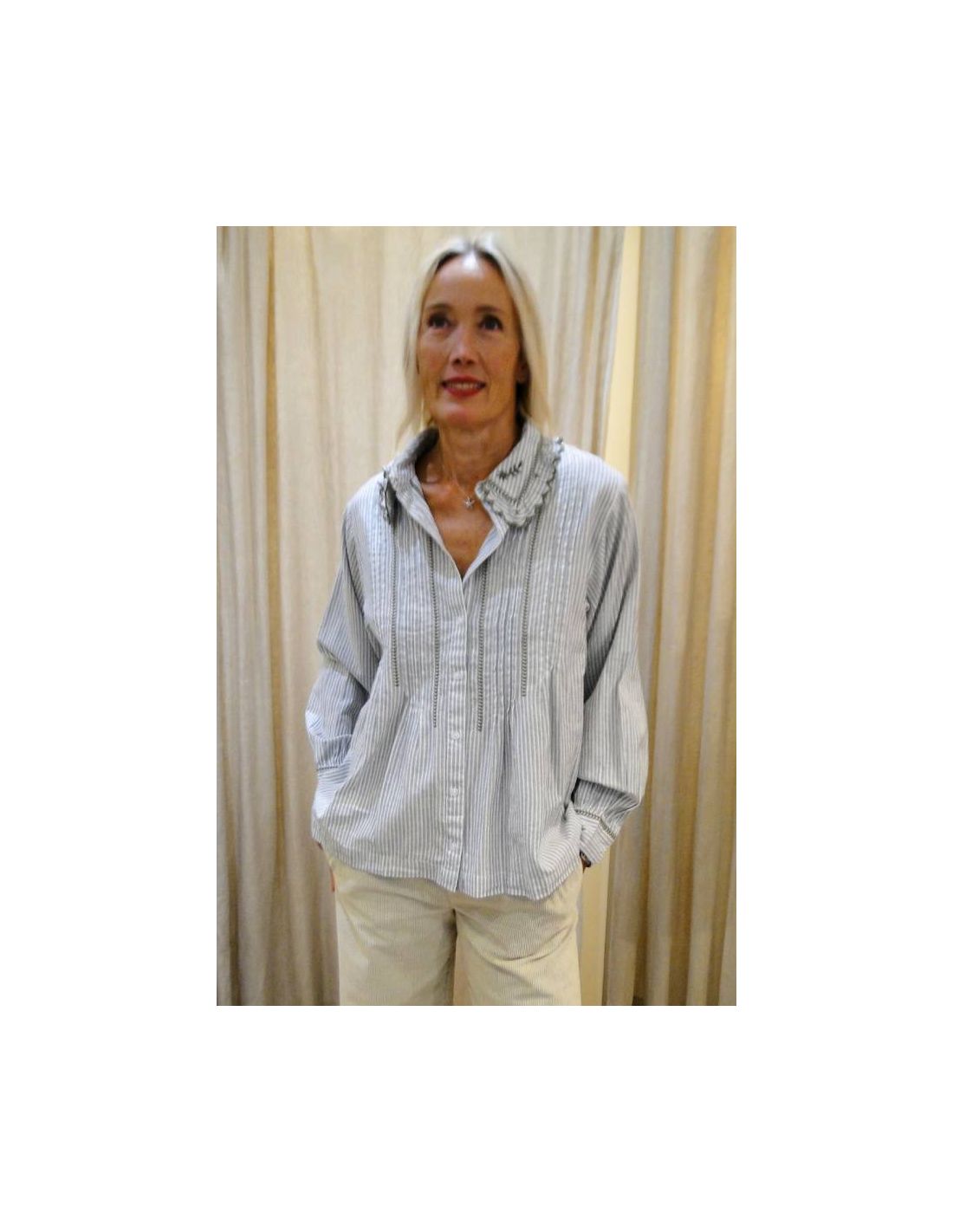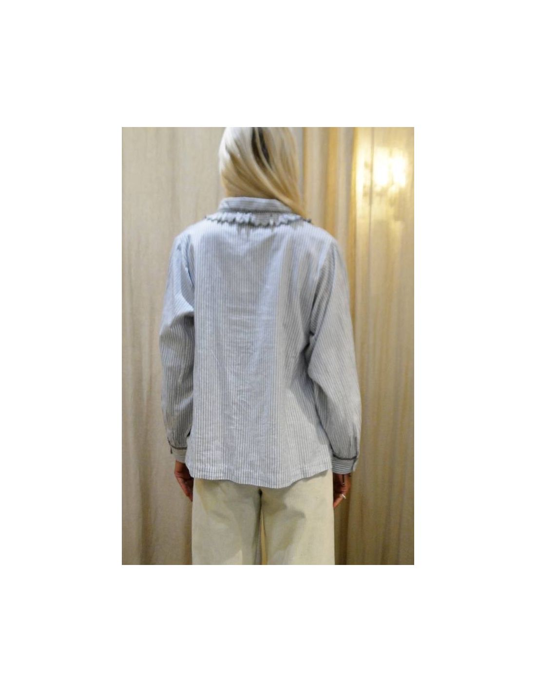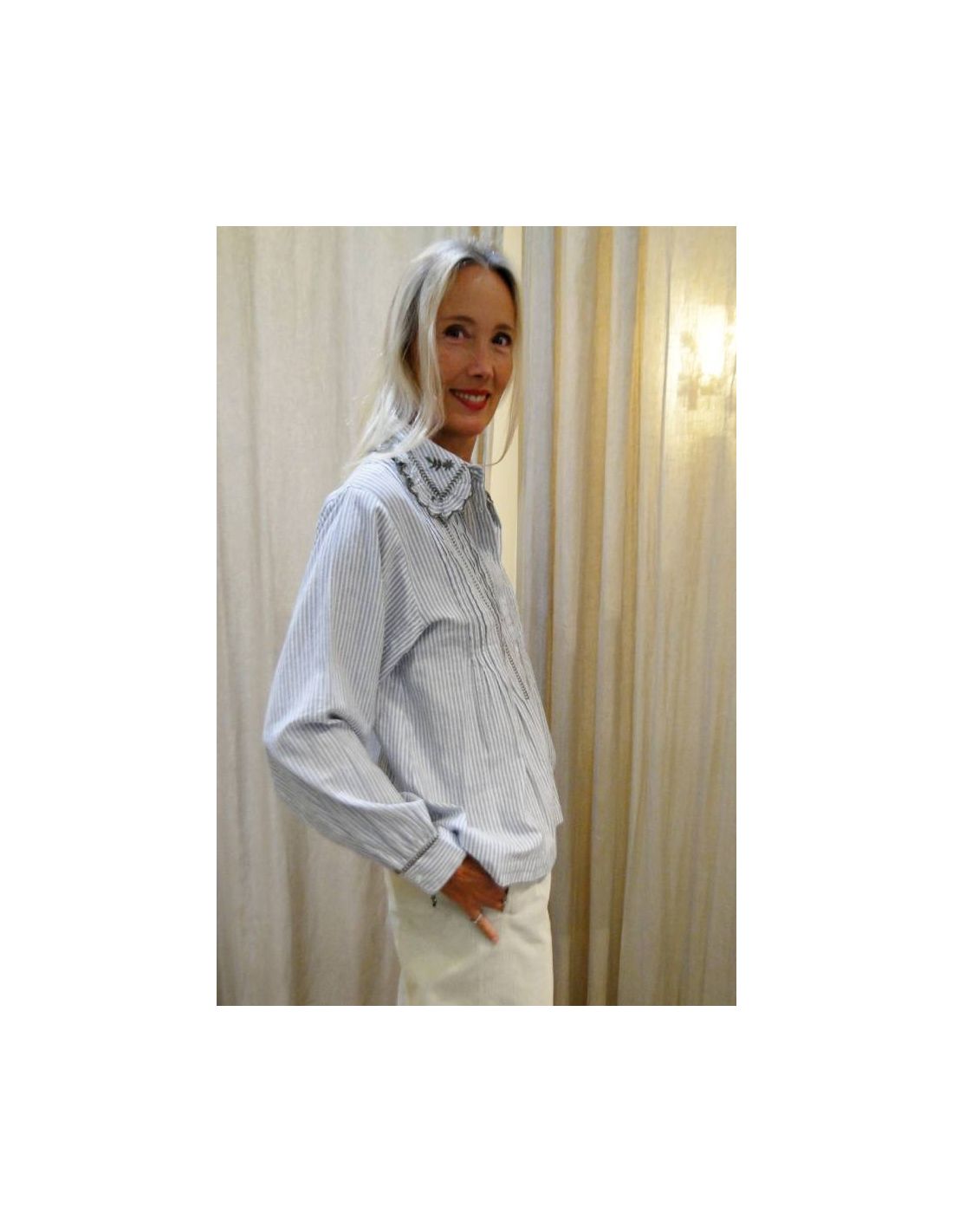 HOD Paris, in the new Fall/Winter 2025 collection, offers us a new shirt model, the CLAUDIA. In gray, it features white and light blue stripes with taupe/gray embroidery. It is made of cotton. With its Peter Pan collar and embroidery on the front, collar, and cuffs, this shirt adds a touch of femininity to your outfits. The colors are fairly neutral and pair well with jeans or more dressy pants. Its shape is straight.