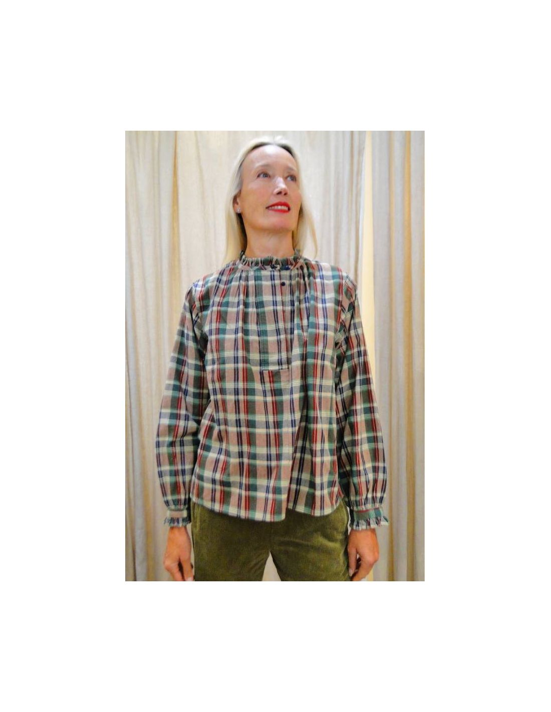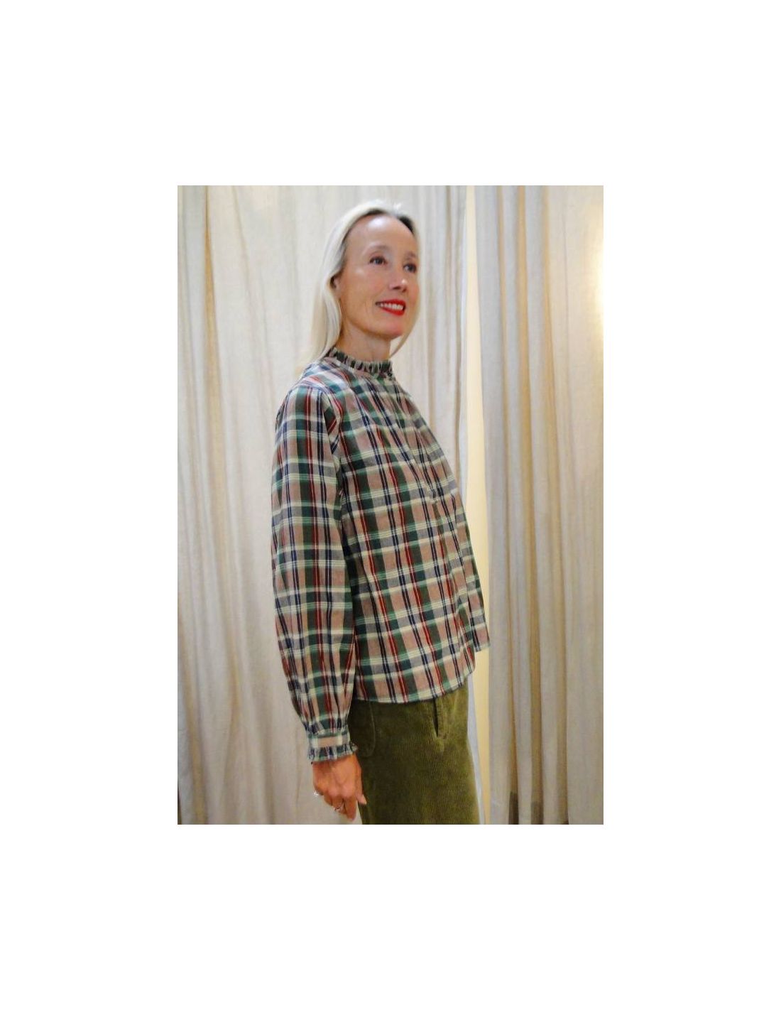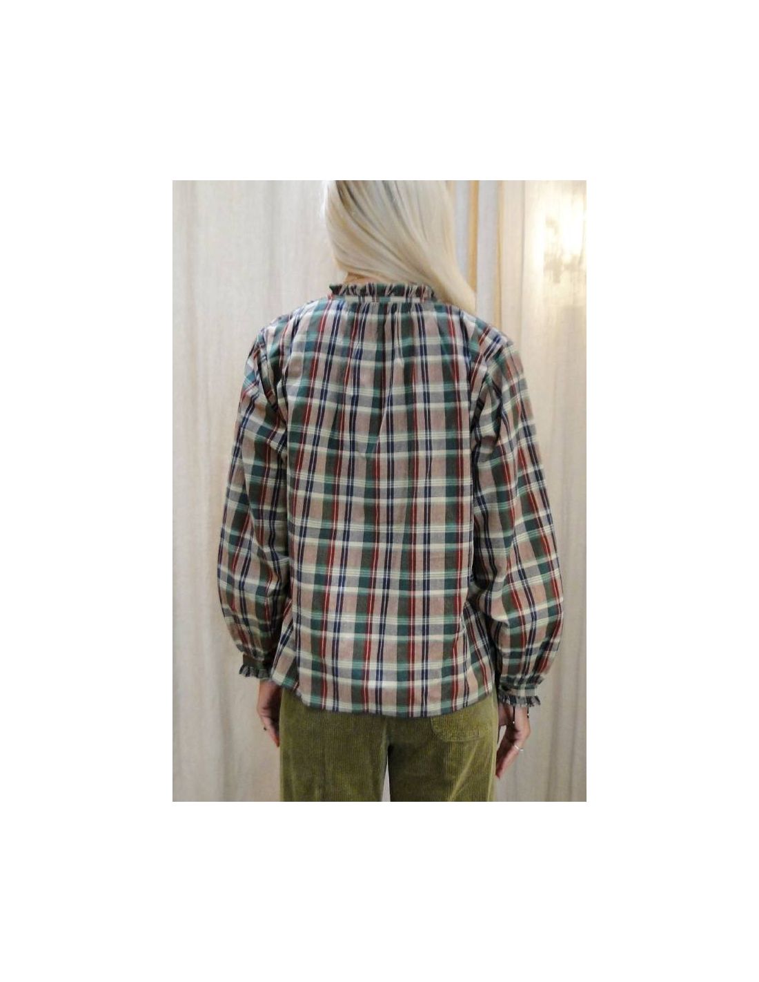 Blouse with a ruffled collar and an inside buttoned tab. Long sleeves with a ruffled finish. This shirt has a slight volume with back pleats. Its back length...